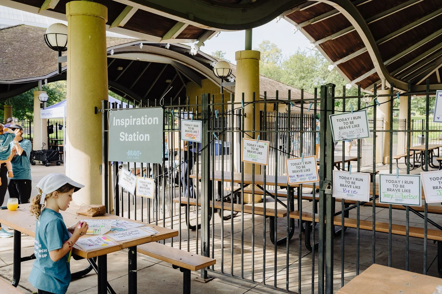 Participants wrote names of loved ones on the “I Run to be Brave Like” bibs, wore “Running On Hope” temporary tattoos, and pinned on Survivor bibs to recognize their own cancer journey. In 2018, at the inaugural Brave Like Gabe 5K, Gabe Grunewald summed up the magic by saying, “Today I can tell you that this life with a rare, incurable cancer, on certain, special days, can be a life lived in technicolor.” Her words continue to resonate every year.